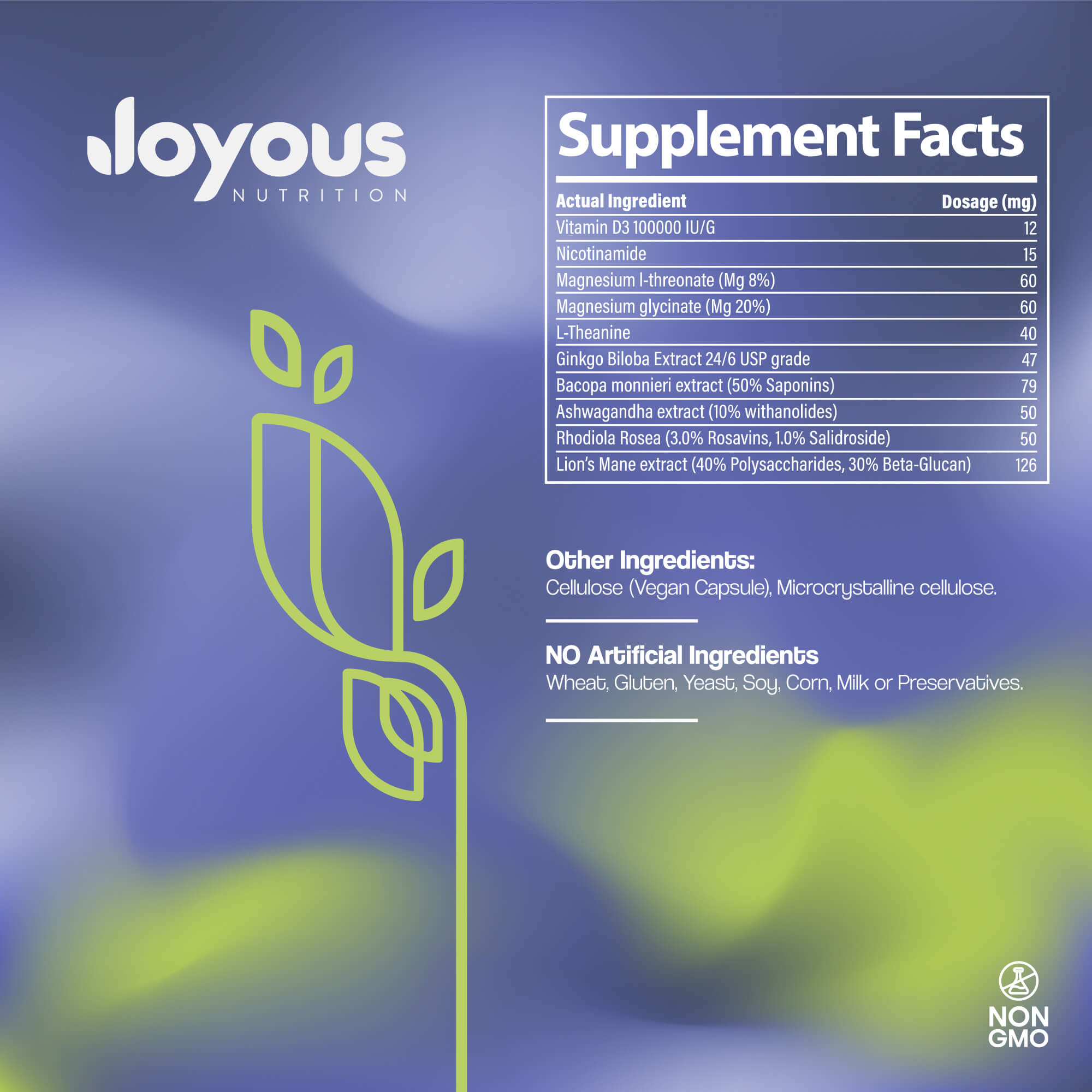 Vitamin D3, Nicotinamide, Magnesium L-threonate, Magnesium Glycinate, L-Theanine, Ginkgo Biloba Extract, Bacopa Monnieri Extract, Ashwagandha Extract, Rhodiola Rosea, Lion's Mane Extract, Cellulose (Vegan Capsule), Microcrystalline Cellulose